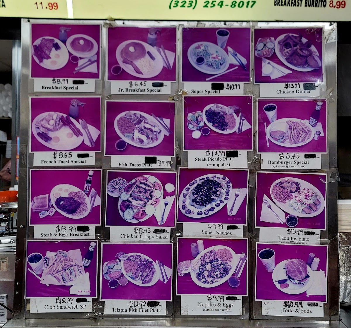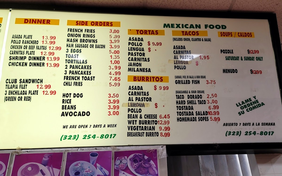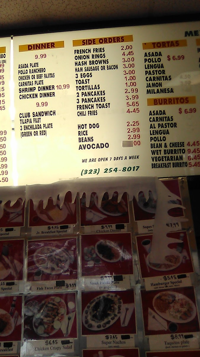Menu highlights noted include dishes such as French Toast Special, Bacon 33 Eggs, Cheeseburger Combo, Chilaquiles, Steak and Eggs, Enchiladas Verdes, Miso Soup, and Menudo, indicating a diversity of Mexican and American breakfast and lunch options.