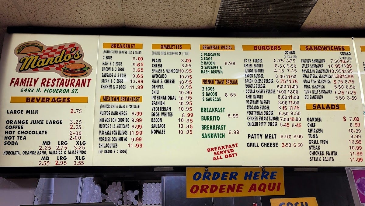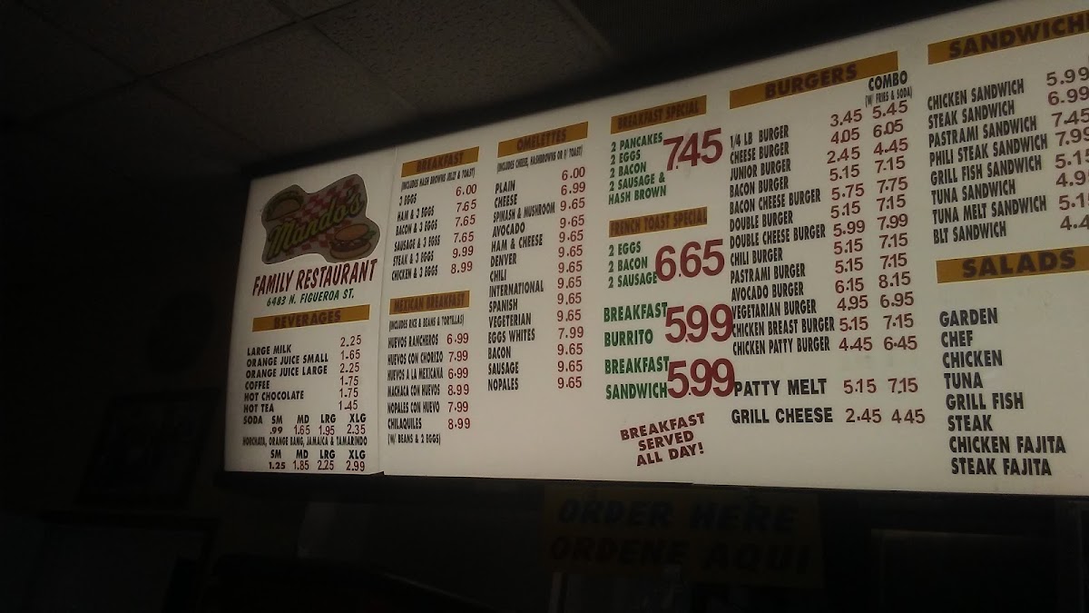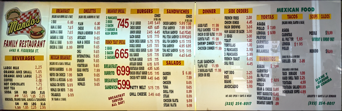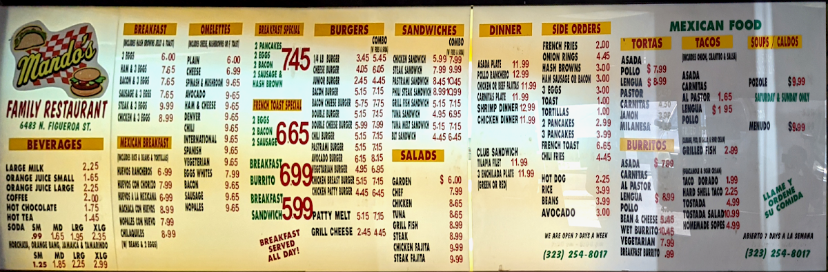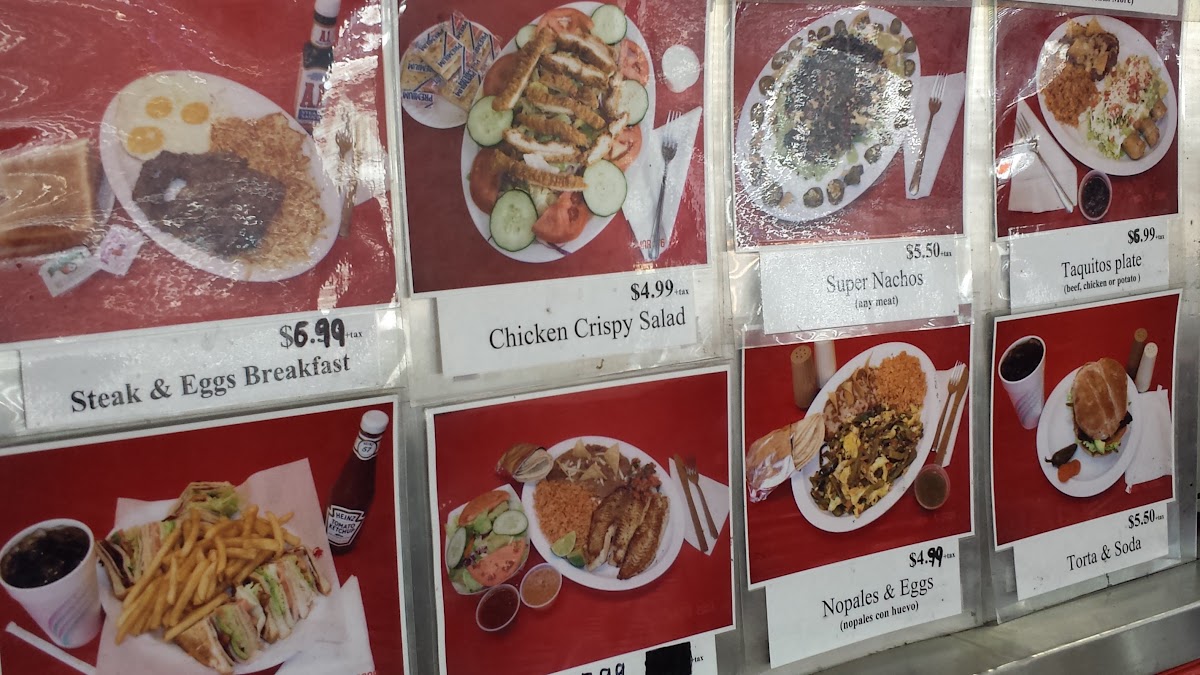 Menu highlights noted include dishes such as French Toast Special, Bacon 33 Eggs, Cheeseburger Combo, Chilaquiles, Steak and Eggs, Enchiladas Verdes, Miso Soup, and Menudo, indicating a diversity of Mexican and American breakfast and lunch options.