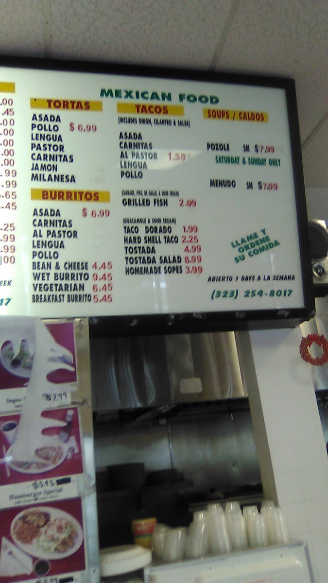 The menu features a variety of options spanning Mexican cuisine, breakfast favorites, and classic hamburger selections. It is organized into distinct categories to facilitate easy selection based on meal preference and time of day.